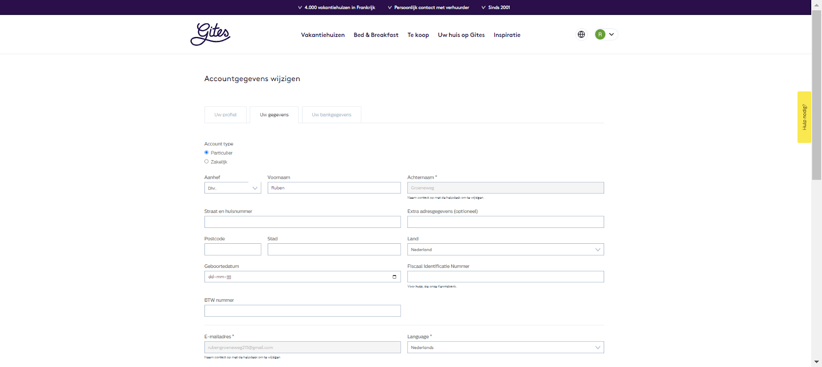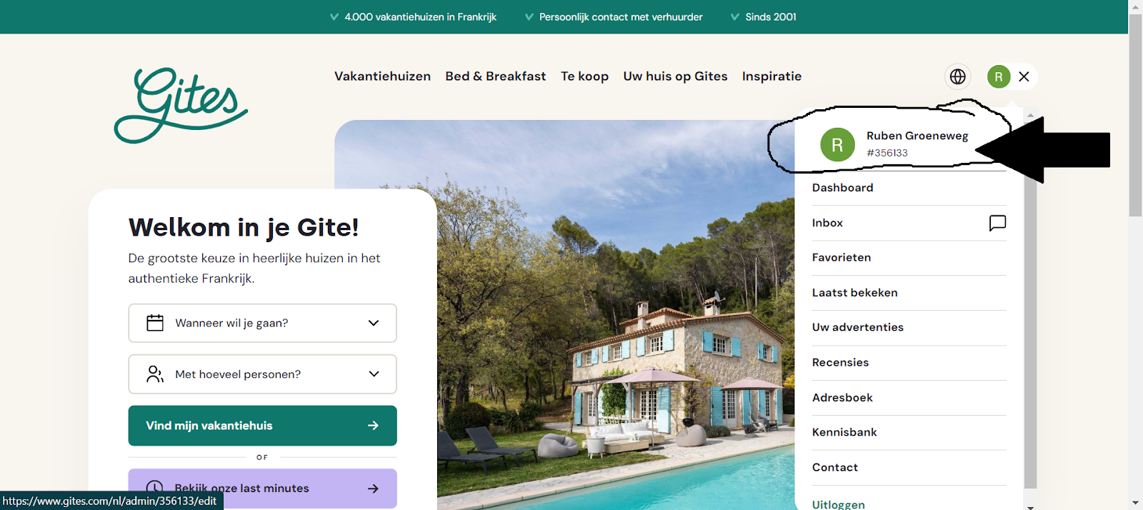 Het invullen van de informatie ivm DAC7 gebeurt op uw account op de site van Gites. In de onderstaande schermafbeelding ziet u waar u uw account kunt vinden. U moet klikken op uw eigen naam in het menu. Dit kan alleen als u bent ingelogd.