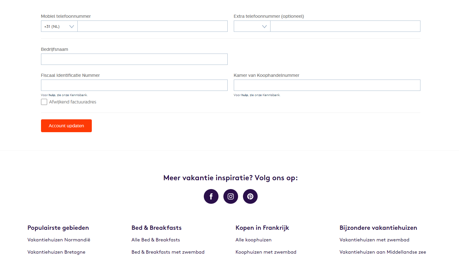 Na het selecteren van de knop ‘Zakelijk’ is uw account ingesteld als een zakelijk account. In bovenstaande schermafbeelding is te zien dat er onderaan de pagina uw Fiscaal identificatienummer kunt invullen en uw KVK-nummer.